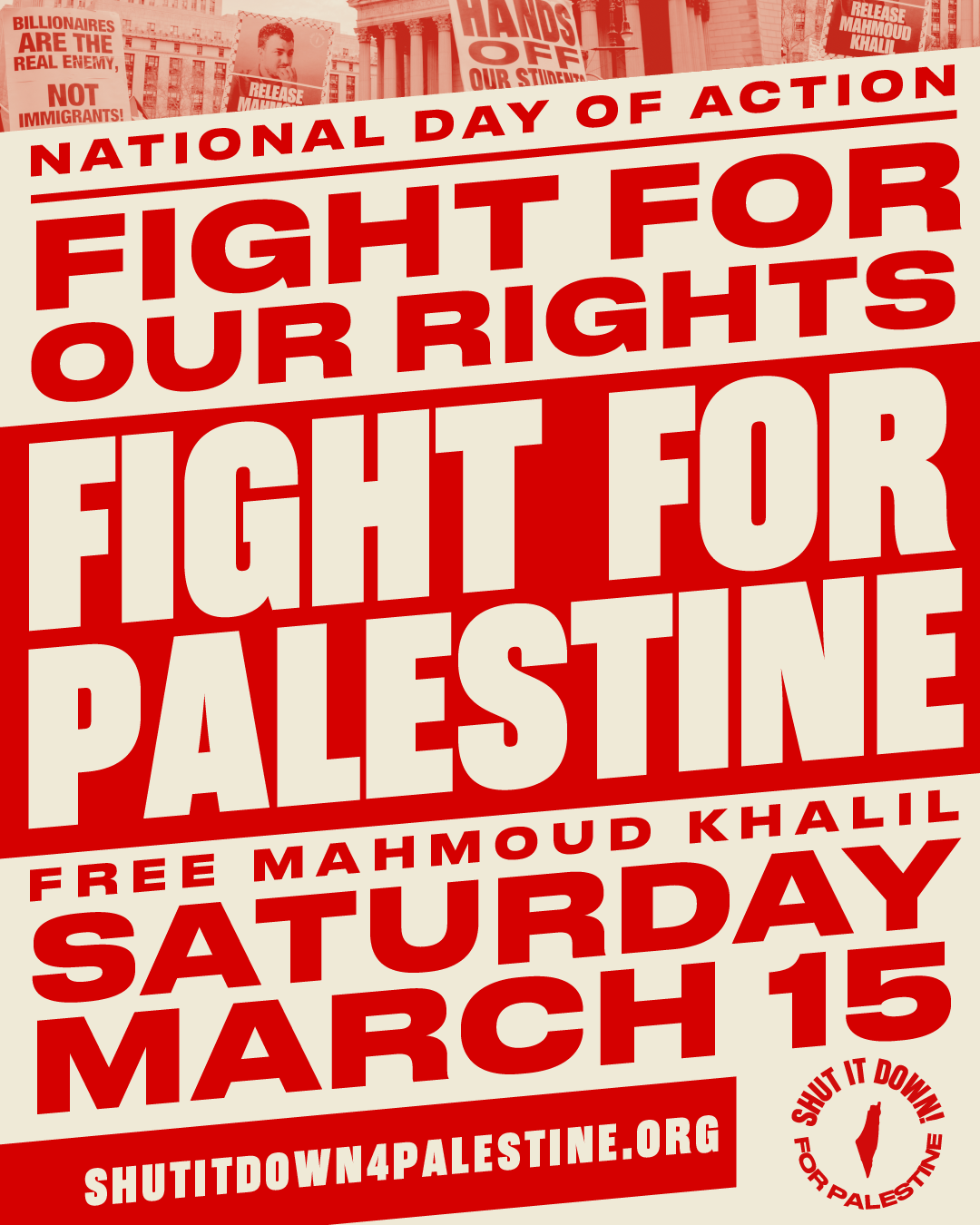 Across the entire country we will take to the streets to demand the immediate release of Mahmoud Khalil and reaffirm our commitment to struggle for a free Gaza!